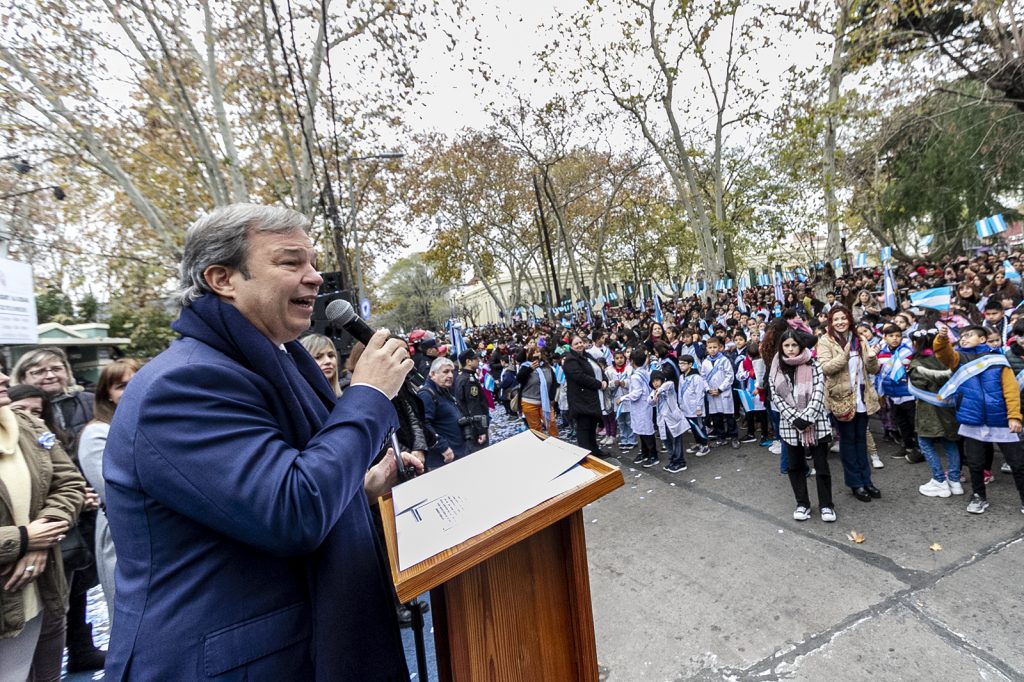 Luego las autoridades se trasladaron a una tarima ubicada en la calle Quintana, donde se realizó la tradicional Promesa a la Bandera junto a miles de alumnos y alumnas de cuarto grado, que incluyó una acción de gracias por parte del presbítero Osvaldo Mouriño, a cargo de la parroquia Inmaculada Concepción.