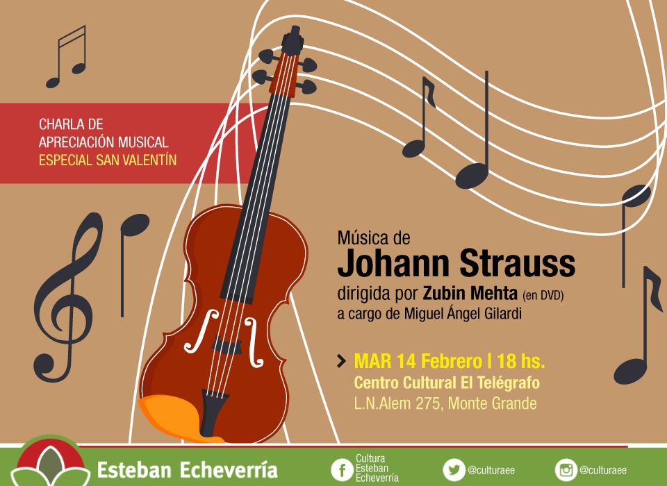 En el marco del Día de los Enamorados, los echeverrianos podrán disfrutar de una jornada de interpretación y apreciación musical del conocido “maestro del vals”, Johann Strauss dirigida por Zubin  Mehta (en DVD), a cargo del Director del Ensamble Musical municipal, Miguel Ángel Gilardi.