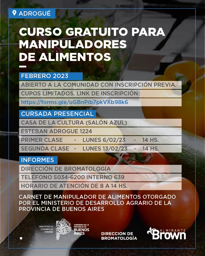 Está abierta la inscripción del nuevo curso oficial de “Manipulación Segura de Alimentos”, de modalidad presencial, promovido a través de la Dirección de Bromatología de la Comuna browniana.