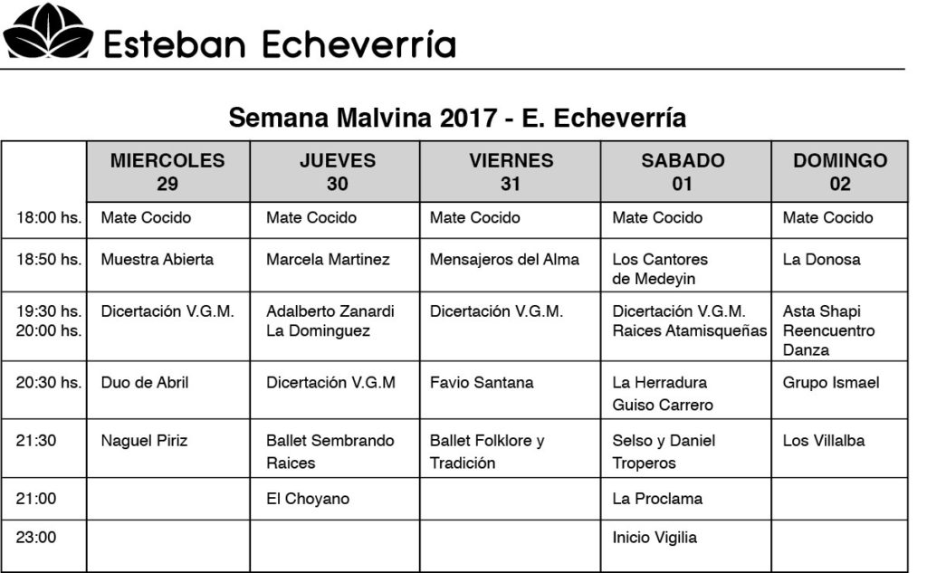 Desde el miércoles 29 de marzo hasta el próximo domingo 2 de abril, se desarrollará la Semana de Malvinas en Esteban Echeverría, en donde se realizarán distintas actividades gratuitas desde las 18, en la carpa que se instalará durante todo el día en la Plaza de los Fundadores, frente a la estación de ferrocarril de Monte Grande.
